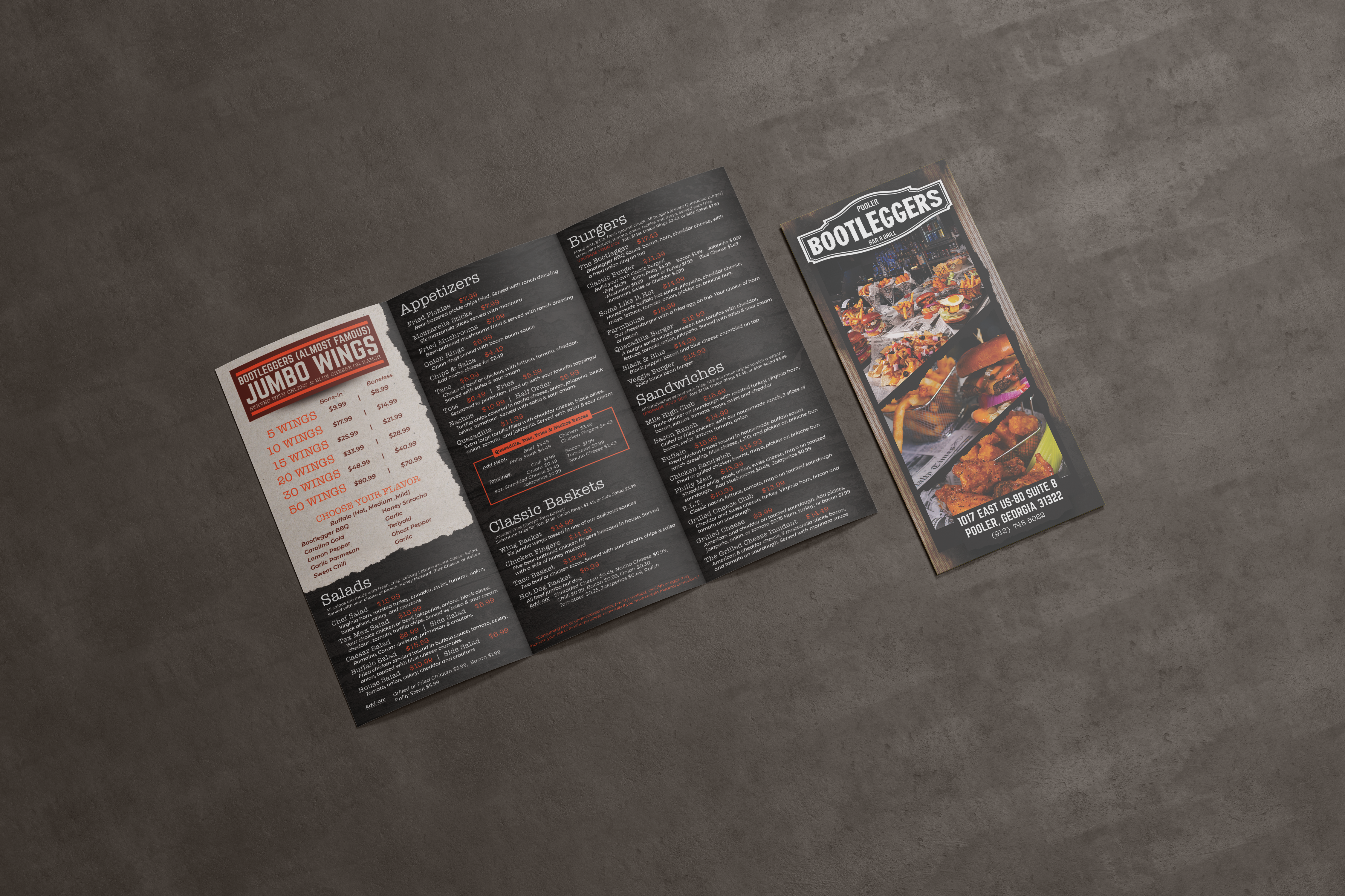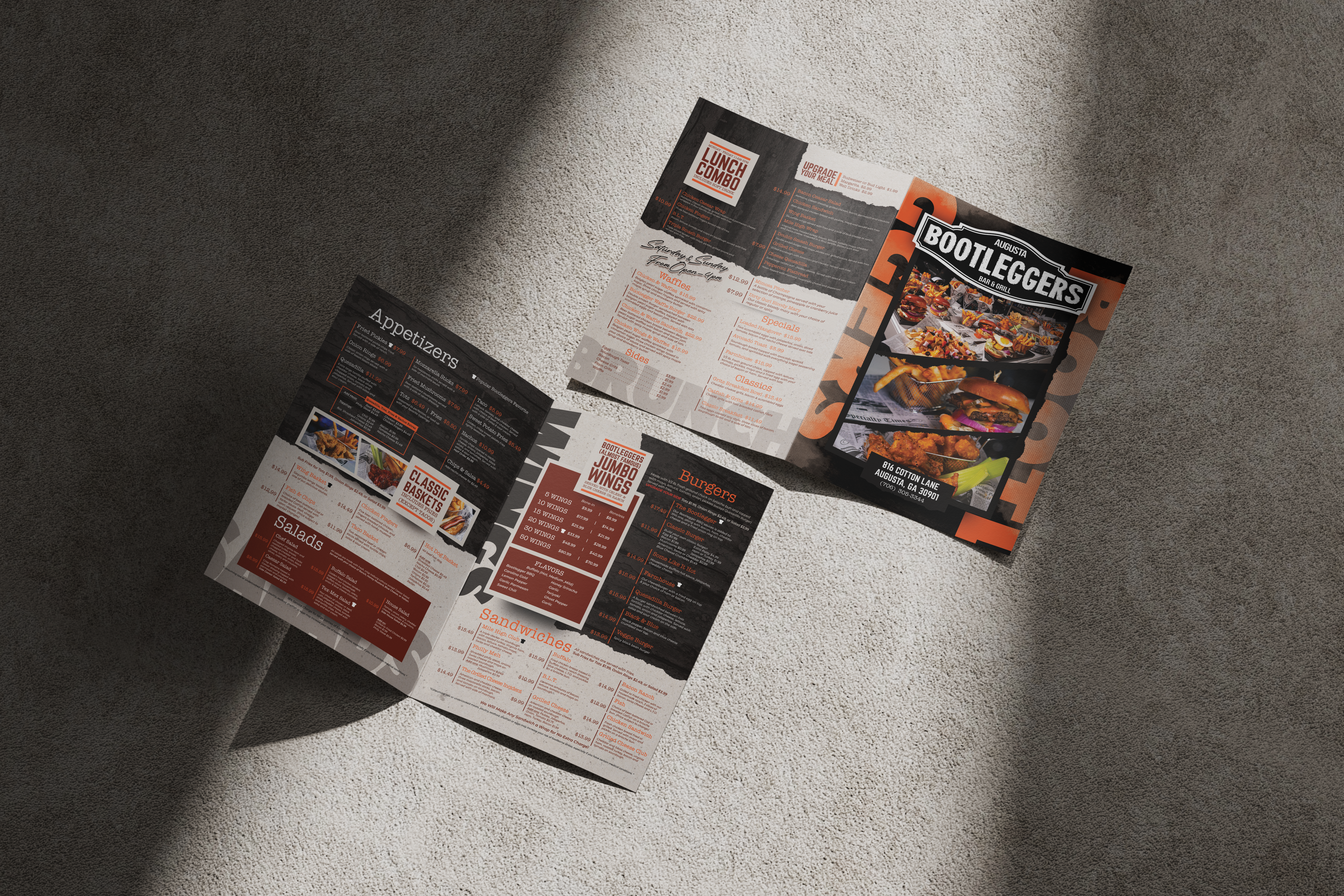 This project encompassed a full in-house refresh for Bootleggers, with variations for both locations in Augusta and Pooler. We designed new food and drink menus along with a trifold marketing brochure, ensuring consistency across all touchpoints. Complementing the design work, we produced food photography intended for multi-purpose use across food delivery platforms, the existing website, and social media content to create a cohesive visual system that supports both in-store experience and digital marketing.